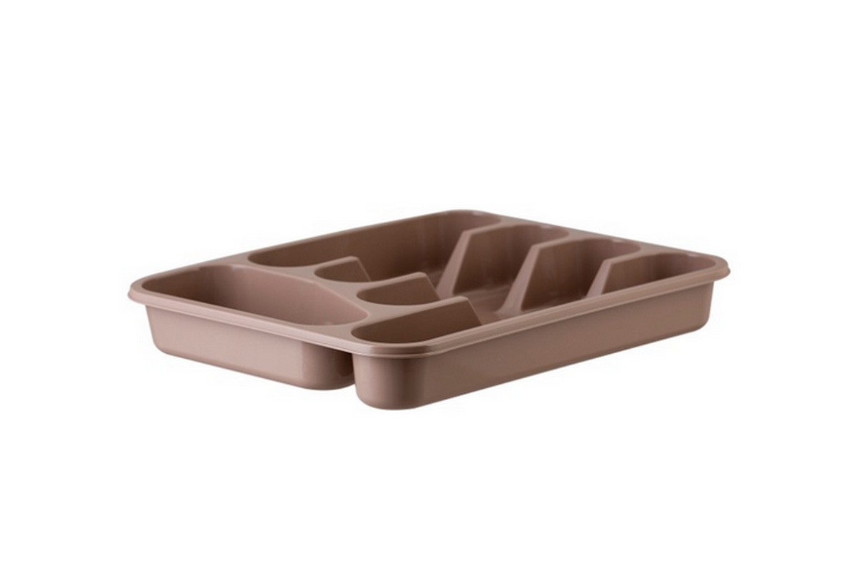 Лоток для столовых приборов В такой лоток из качественной безопасной пластмассы можно отправить на длительное хранение не только ножи, вилки и ложки, но и вещи, которыми мы пользуемся не так часто – консервный нож, пресс для чеснока, специальный нож для чистки картофеля и многое другое. В компактном, но вместительном пластиковом лотке для столовых приборов место найдется для любой важной мелочи. Состав: пластик. Размер изделия (мм): 333*260*45