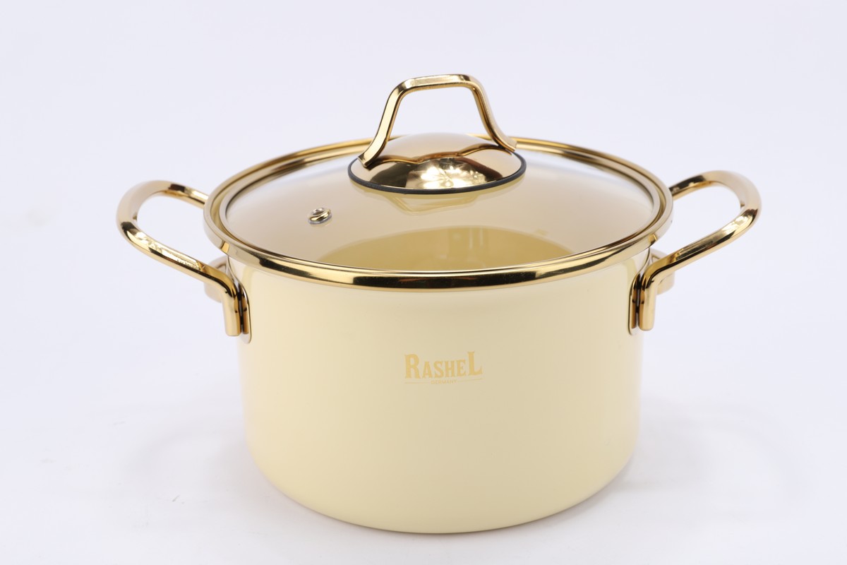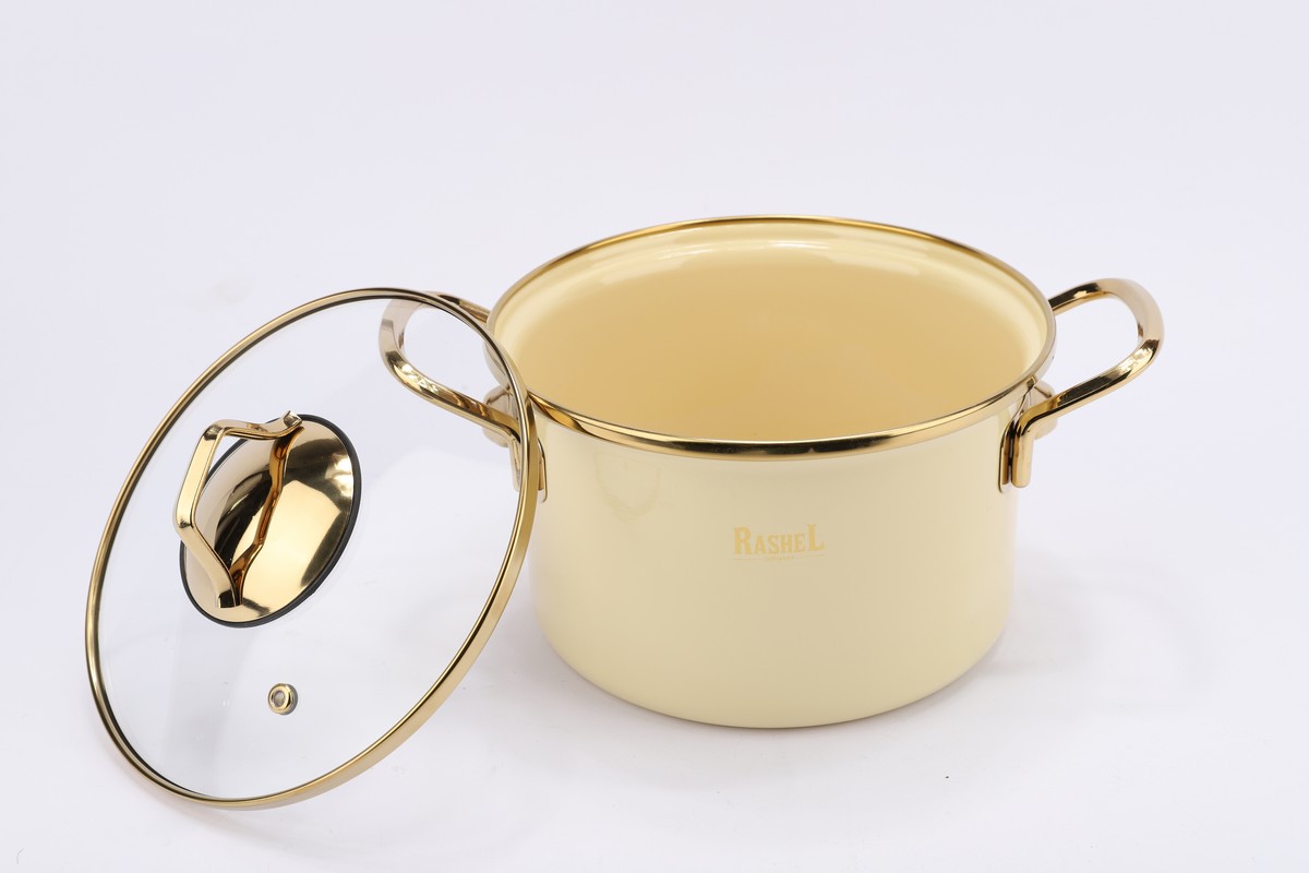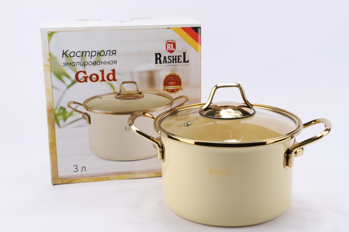 Кастрюля 3 л эмалированная со стекл. кр., ручка золото; цвет:кремовый - Объём кастрюли 3л, d=18 см; - Толщина стенки 1,5 мм; - Трехгранные ручки из нержавеющей стали 18/10 покрытые золотом; - Стеклянная крышка; - Наружное и внутреннее трёхслойное глянцевое эмалированное покрытие; - Внутреннее кремовое эмалированное покрытие; - Индивидуальная подарочная упаковка; - Подходит для всех видов плит, включая индукционные.
