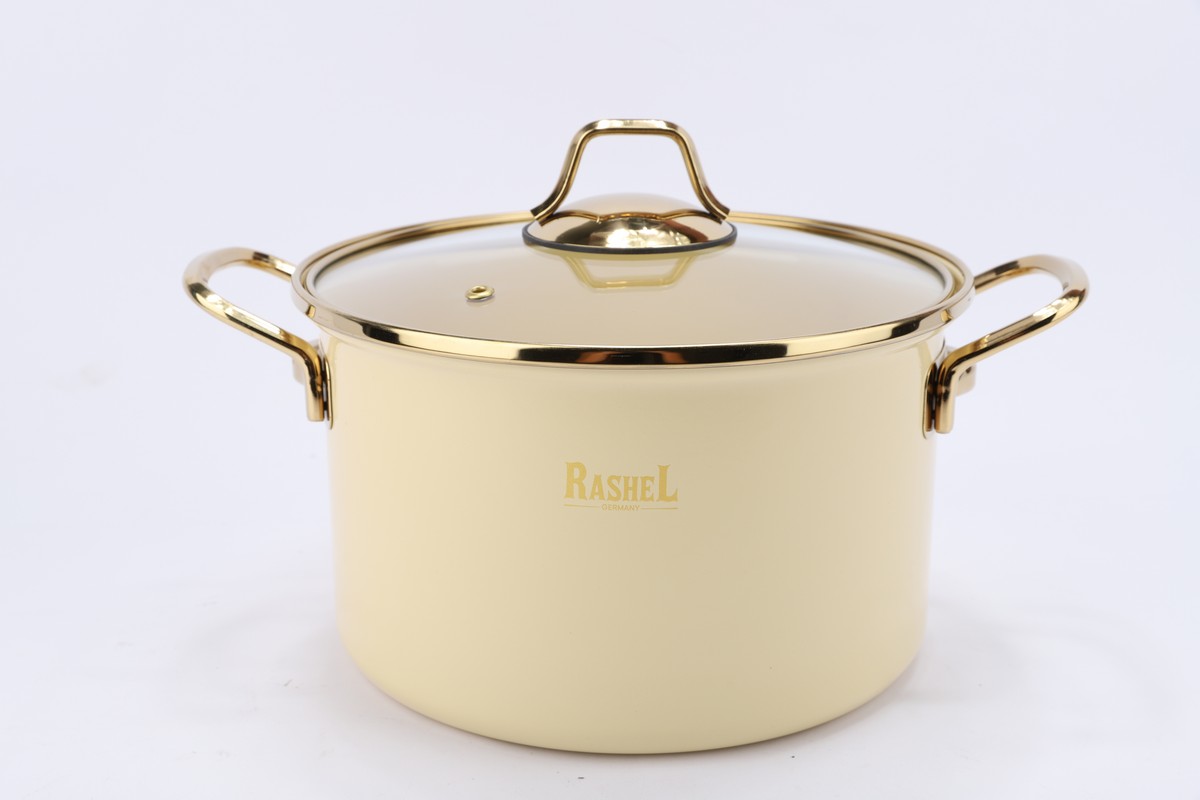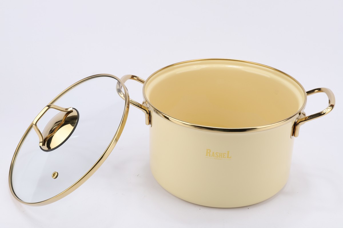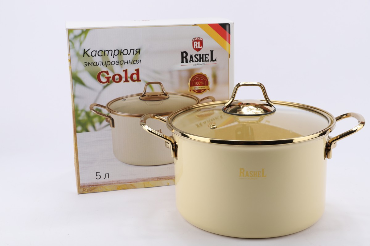 Кастрюля 5 л эмалированная со стекл. кр., ручка золото; цвет:кремовый - Объём кастрюли 5л, d=22 см; - Толщина стенки 1,5 мм; - Трехгранные ручки из нержавеющей стали 18/10 покрытые золотом; - Стеклянная крышка; - Наружное и внутреннее трёхслойное глянцевое эмалированное покрытие; - Внутреннее кремовое эмалированное покрытие; - Индивидуальная подарочная упаковка; - Подходит для всех видов плит, включая индукционные.