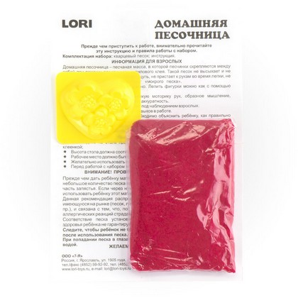 Домашняя песочница - песчаная масса, в которой песчинки скрепляются между собой при помощи пластичного акрилового клея. Такой песок не высыхает и не застывает на воздухе, приятный на ощупь, не пристает к рукам во время лепки, не пачкает одежду. Использовать можно неоднократно. Занятия с набором развивают мелкую моторику, образное мышление, воспитывают усидчивость, терпение, аккуратность. Песок 150 гр., формочка, инструкция.