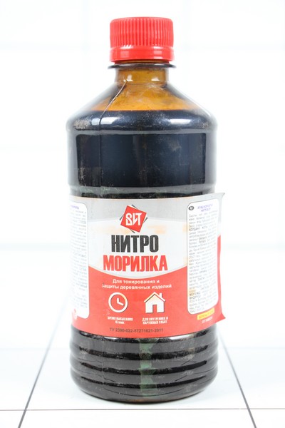 Нитроморилка 0,5 л.НАЗНАЧЕНИЕ: для тонирования и защиты деревянных изделий, эксплуатируемых в атмосферных условиях и внутри помещений. СПОСОБ ПРИМЕНЕНИЯ: перед применением взболтать. Наносить в один или несколько слоев до достижения требуемой интенсивности цвета на предварительно подготовленную (очищенную и зашкуренную) поверхность. СПОСОБ НАНЕСЕНИЯ: наносить кистью, валиком или тампоном.ВРЕМЯ ВЫСЫХАНИЯ одного слоя при температуре (20±2)°С – 15 минут.СОСТАВ:нитролак, органические растворители и красители.