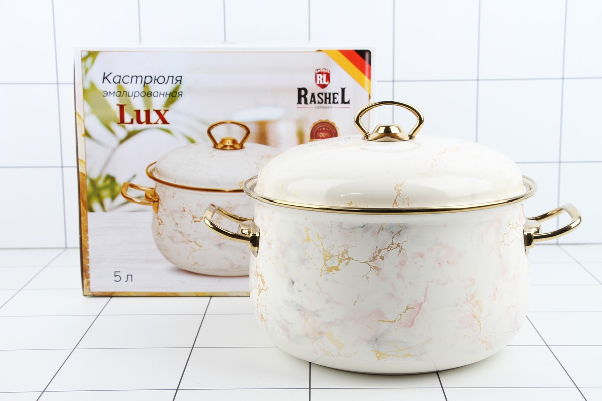 Кастрюля 5 л эмалированная с эмал. кр., цвет: мрамор кремовый - Объём кастрюли 5 л, d=22 см; - Ручки из нержавеющей стали 18/10 покрытые золотом; - Стальная эмалированная крышка; - Наружное и внутреннее трёхслойное глянцевое эмалированное покрытие; - Индивидуальная подарочная упаковка; - Подходит для всех видов плит, включая индукционные.