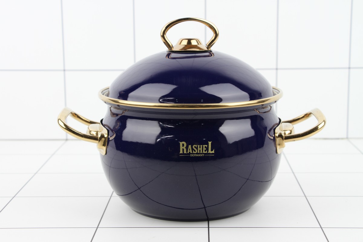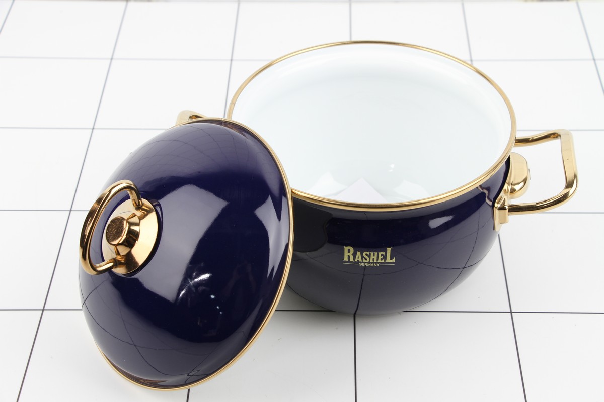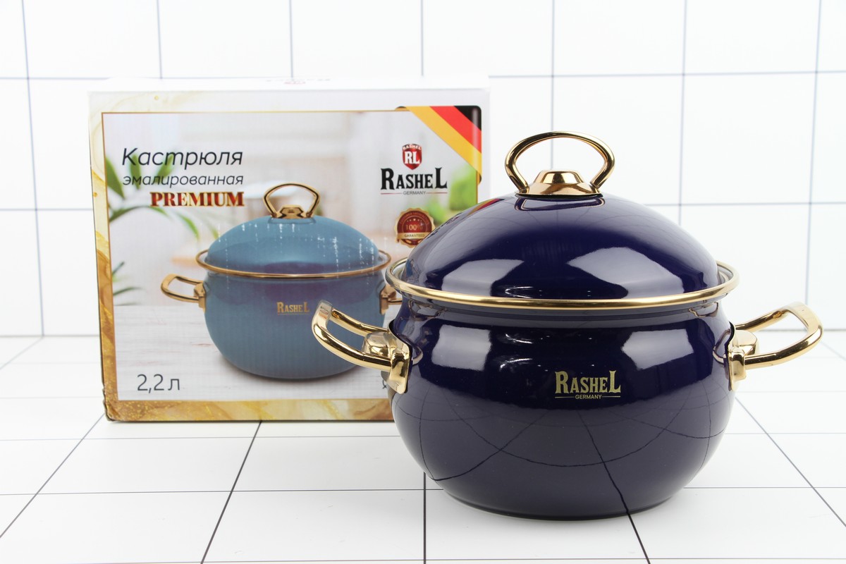 Кастрюля 2,2л эмалированная (синяя) эмал. кр.; ручки золото - Объём кастрюли 2,2 л, d=16 см; - Ручки из нержавеющей стали 18/10; - Стальная эмалированная крышка; - Наружное и внутреннее трёхслойное глянцевое эмалированное покрытие; - Индивидуальная подарочная упаковка; - Подходит для всех видов плит, включая индукционные.