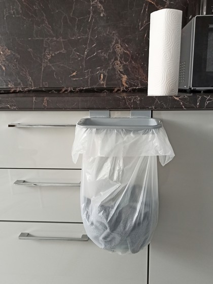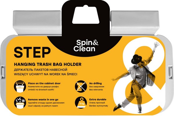 Держатель для пакетов навесной Spin&Clean STEP - многофункциональный помощник для создания чистоты в доме. Держатель очень компактный, его можно использовать вместо контейнера для мусора или дополнительно к мусорному ведру и сортировать отходы. Навесной держатель STEP удобно использовать во время приготовления пищи, сметая весь мусор со столешницы сразу в пакет. А после использования его легко спрятать, перевесив внутрь шкафа. Прочные крепления держателя позволяют размещать его как внутри, так и снаружи шкафа без помощи саморезов, гвоздей и наклеек, не повреждая поверхность мебели. Держатель изготовлен из безопасного пластика, без фенолов и фталатов, не выделяет вредных веществ. Его можно использовать для хранения овощей и фруктов, а также для бытовой химии и других принадлежностей. Держатель STEP выдерживает нагрузку до 6 кг. Упаковку и сам держатель после использования можно сдать в переработку. С держателем мусорных пакетов STEP от Spin&Clean создать чистоту и порядок легко и быстро.